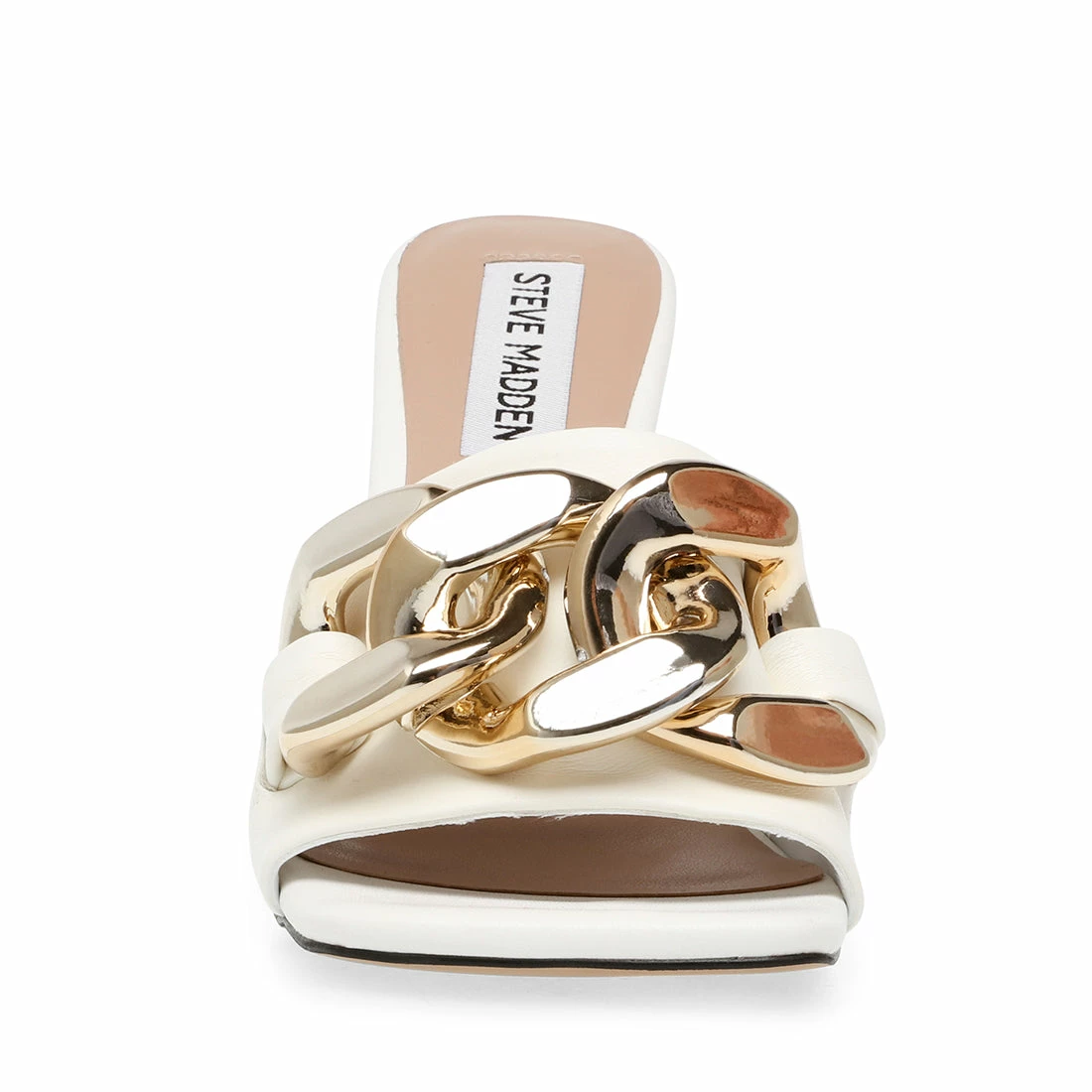 Trim your toes in statement chain! Oversized metal links dress up this sexy slide, while a just-high-enough heel lifts and flatters.ย