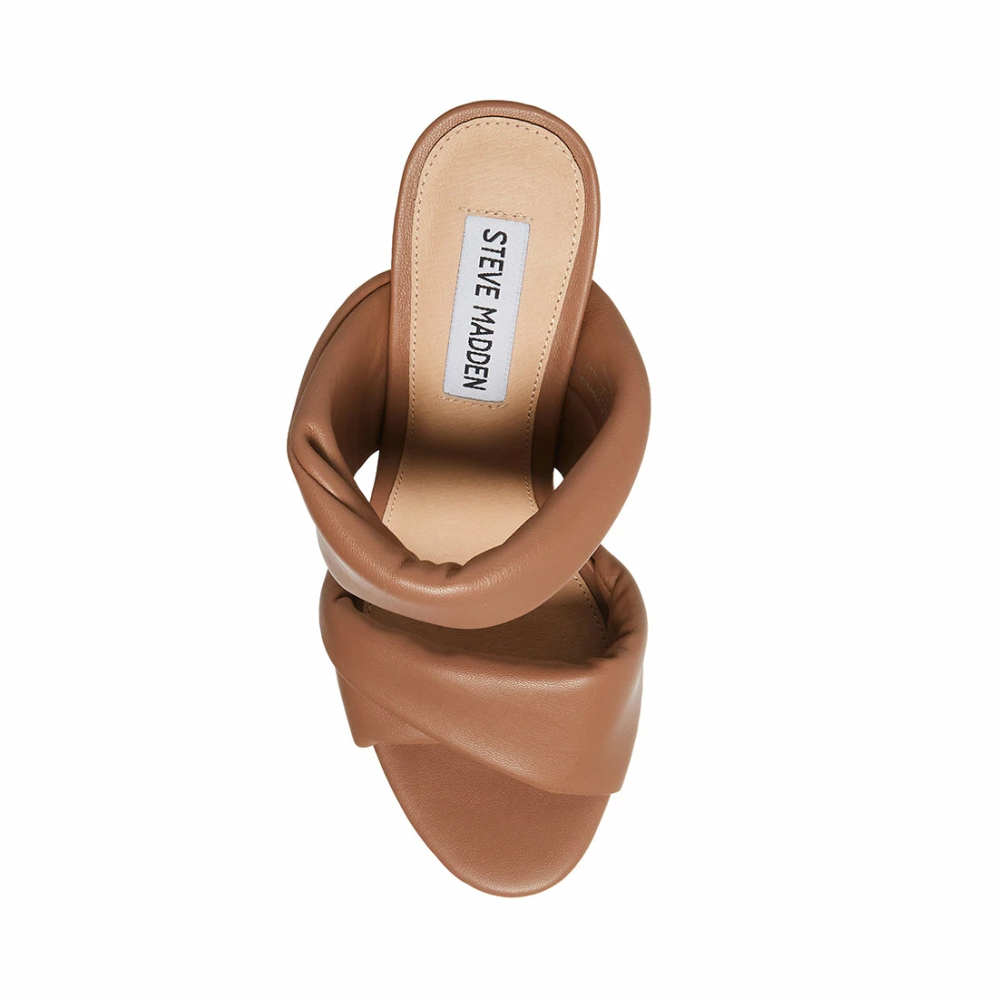 Sleek lines and minimalist styling makes TRISHA the sandal to be seen in. Crafted from smooth vegan leather, this slip-on style features puffy intertwined straps and a tall block heel.
