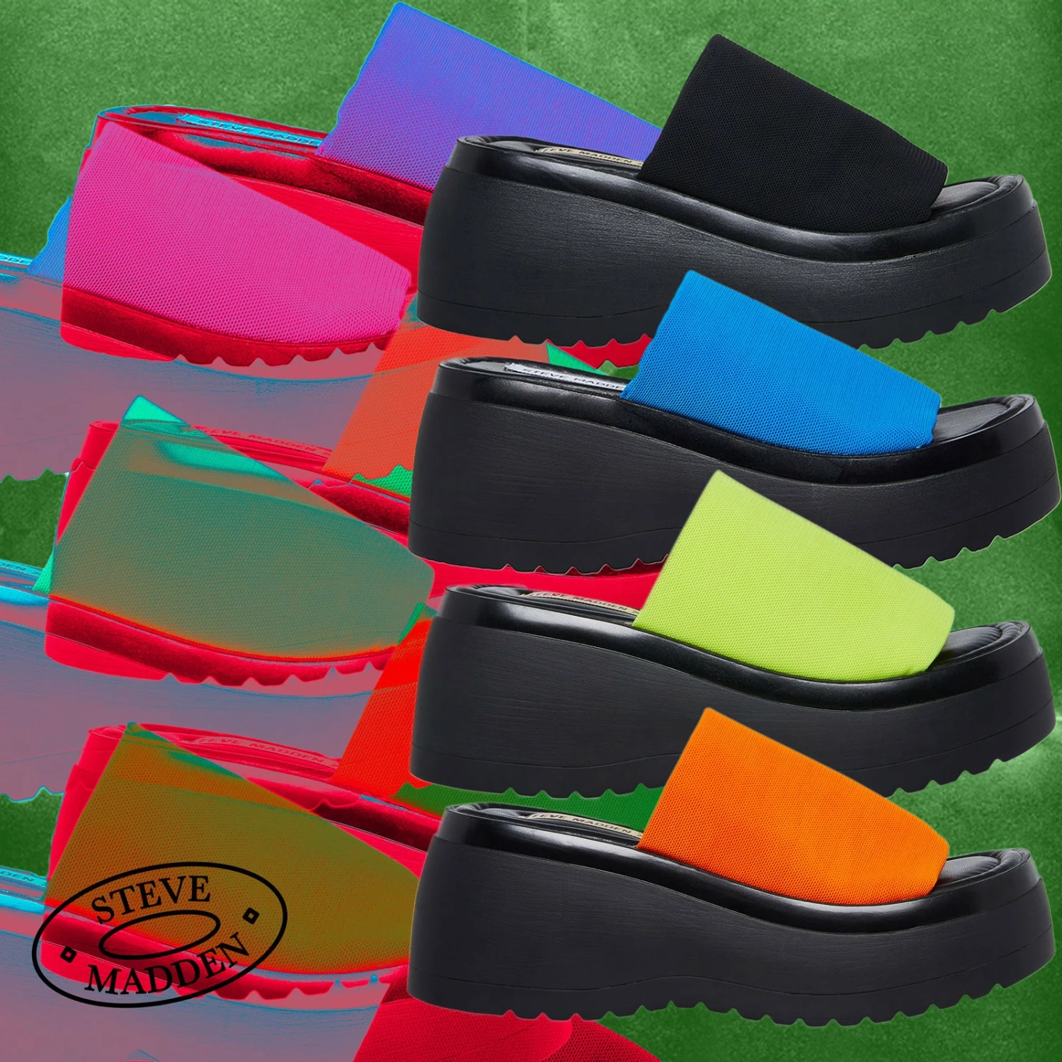 Label loyalists are sure to love SCRUNCHY, as this slideโs stretchy upper and chunky treaded wedge sole make for a style thatโs quintessentially SM! Take your pick between classic black or bright spring colors!