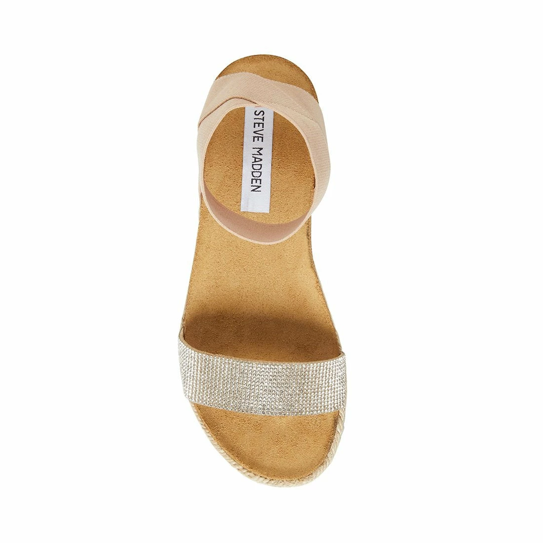 A rhinestone-covered toe band jazzes-up this otherwise low key sandal, featuring a rustic espadrille platform and natural color palette. Elastic straps make for a flexible fit, while a contoured cork sole ensures maximum comfort.ย